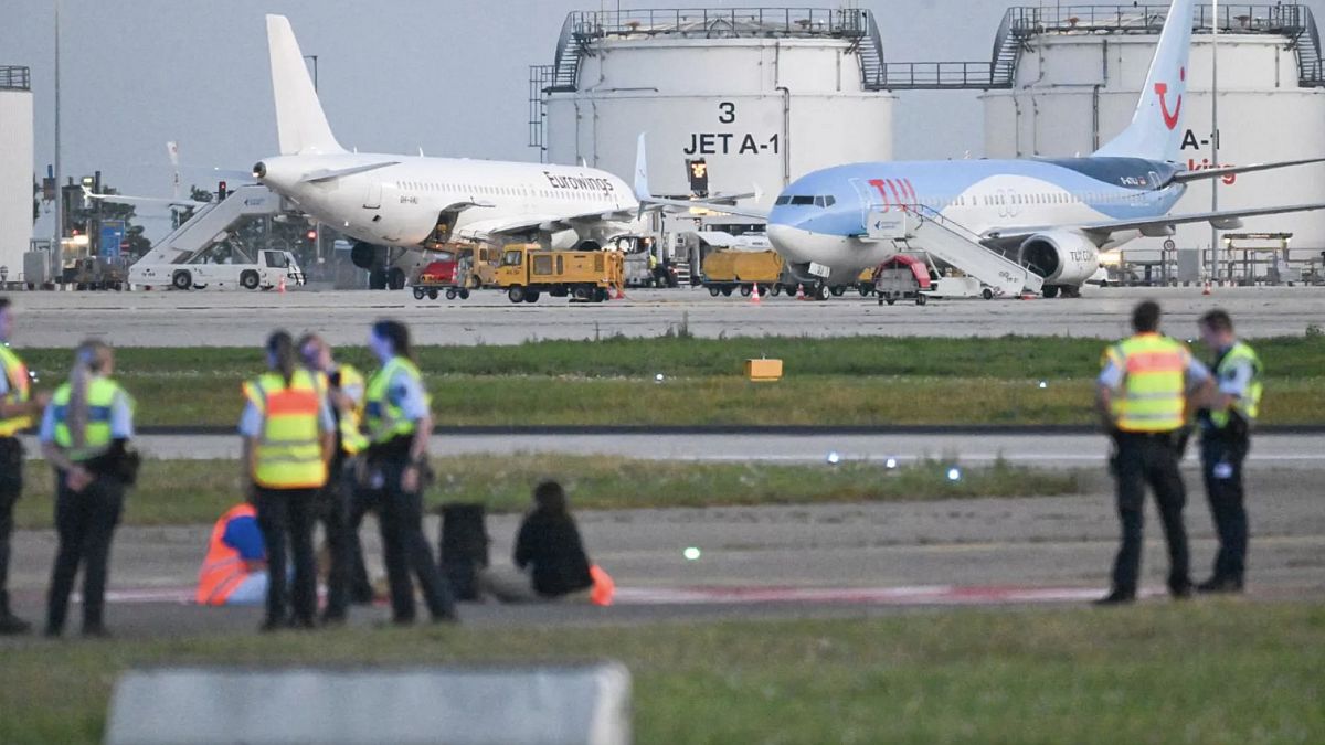 Alman haber ajansı dpa’nın haberine göre, Köln-Bonn’da iki kişinin iniş pistinde kendilerini bağladığının bildirilmesi üzerine uçuşlar askıya alındı, ancak daha sonra yeniden başlatıldı. Polis, havaalanının çitinde bir delik bulunduğunu söyledi.