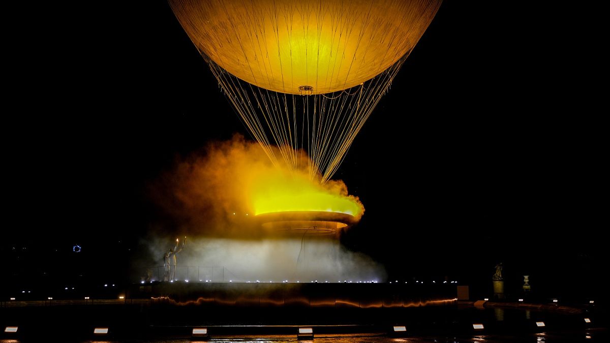 Eski Fransız Olimpiyatçılar Marie-Jose Perec ve Teddy Riner tarafından yakılan Olimpiyat meşalesi, bir sıcak hava balonuyla gece gökyüzüne doğru yavaş yavaş yükselmeye başladı.