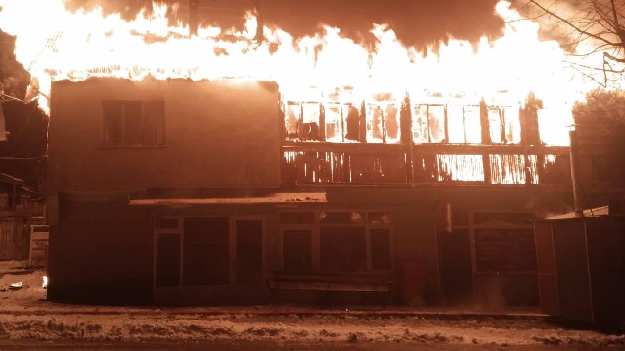 Yangında 2 katlı ahşap ev kullanılamaz hale gelirken, diğer binanın çatısı da hasar gördü.